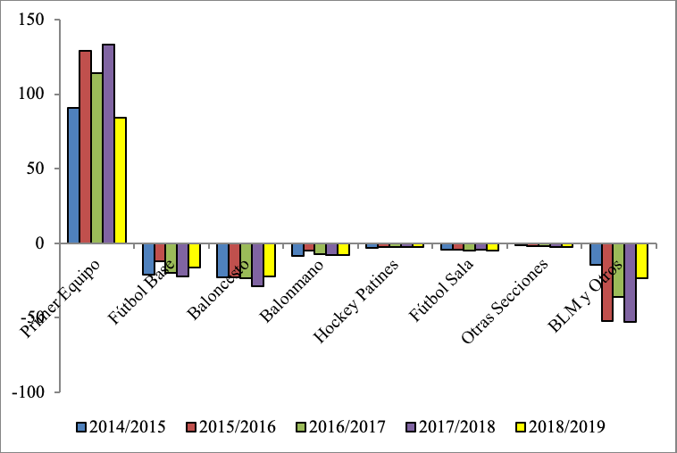 De un rápido vistazo vemos que la única unidad de negocio que ha generado beneficios en el período de análisis es el primer equipo de fútbol, el resto de segmentos ha acabado cada año fiscal en pérdidas y absorben el beneficio de éste.