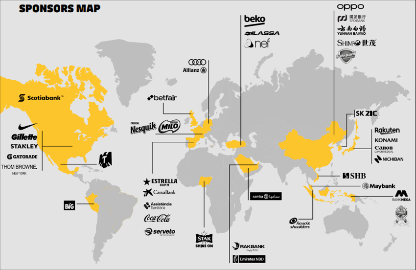 Los ingresos por derechos televisivos y comercialización suman conjuntamente un 77%. Acorde a la imagen global del club, que ha abierto sedes comerciales en Hong Kong y Nueva York y a cierre del ejercicio 2019 contaba con 39 acuerdos de sponsors (17 globales y 22 locales) como vemos en el mapa.