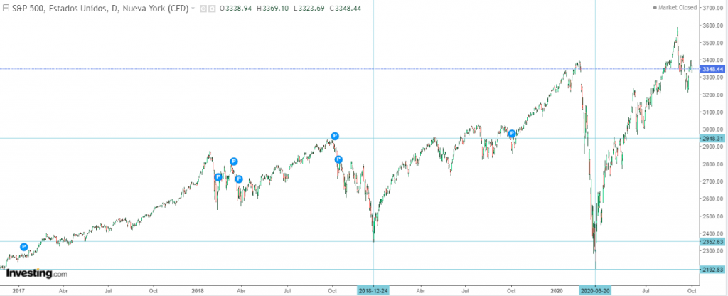 Luego nos encontramos con el coronavirus, que ha tirado a la economía mundial por los suelos, pero el SP 500 ha recuperado terreno llegando incluso a los 3.600 puntos.