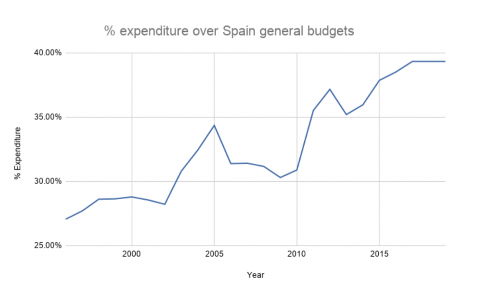 Expresando el dinero destinado a pensiones del estado sobre los presupuestos generales podemos observar la tendencia: