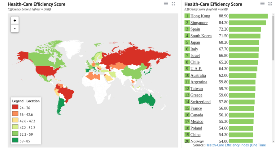 Y esta otra es una magnífica lista del nivel de eficiencia por país en materia de sanidad, (me permito el privilegio de excluir a Hong Kong ante la incertidumbre del futuro porvenir tras su vuelta al partido comunista chino) Singapore encabeza la lista con más de 10 puntos de ventaja al español manteniendo un sistema de salud centralizado en la parte privativa.