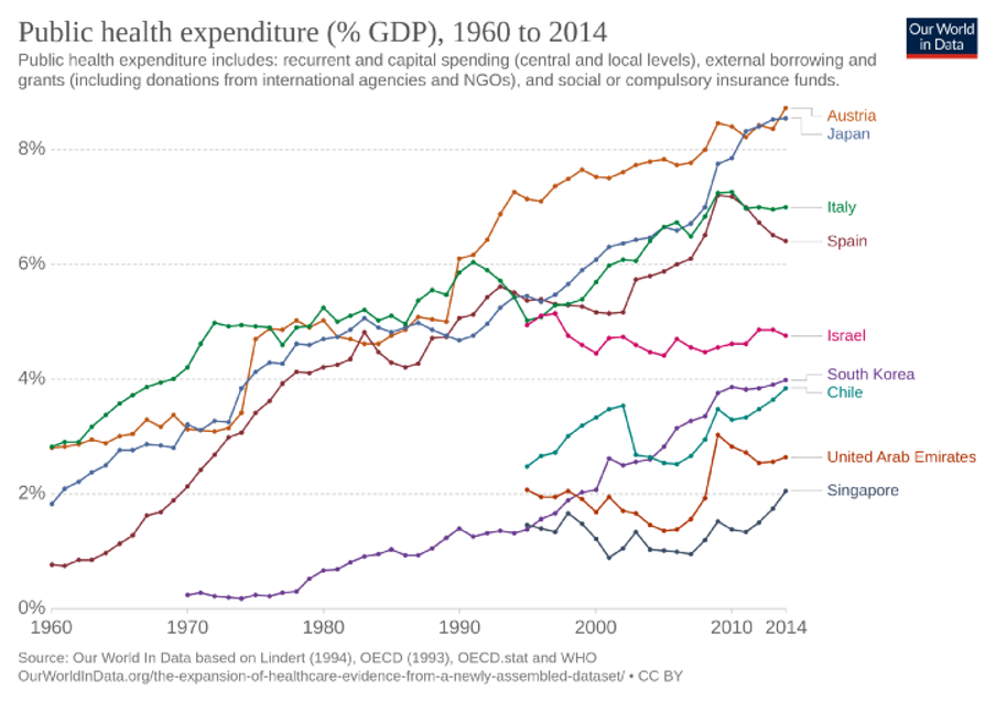 Los clásicos centrarán a EEUU como piedra angular de la exposición, desgraciadamente los yankis destinan el 6.7% del PIB en programas de sanidad pública, similar al 6.3% de España, fuera de cualquier populismo, esta es una lista del gasto público sobre PIB de países (Hasta 2014):